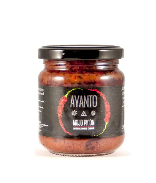 AYANTO es mojo rojo canario natural, sin conservantes ni colorantes y 100% libre de gluten. Ingredientes: Pimienta Palmera, aceite, vinagre de vino, ajos, sal marina natural y un sutil toque de cominos. Nuestro Mojo artesano esta disponible tanto dulce como picante.