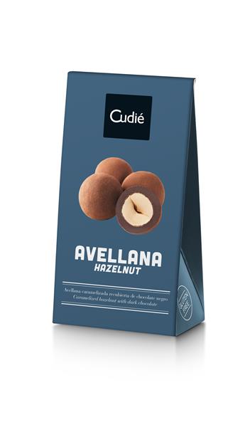 Avellana caramelizada recubierta de chocolate negro y polvo de cacao