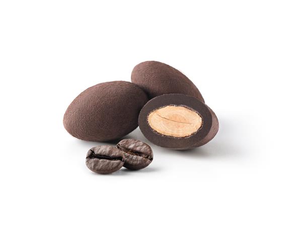 Para los amantes del café y del chocolate. Almendras marconas caramelizadas, recubiertas de delicioso praliné de café y empolvadas con polvo de cacao.