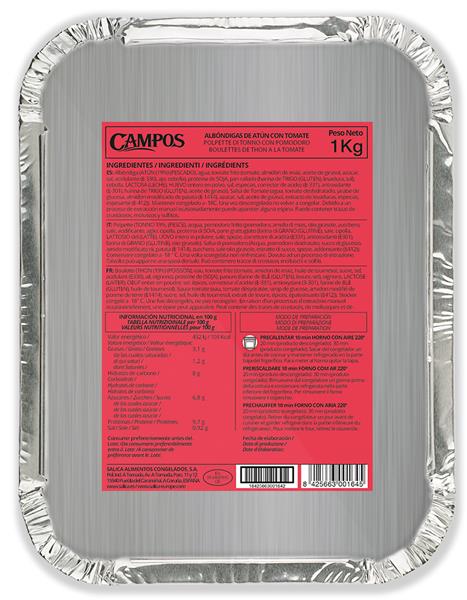 Albóndigas de atún en salsa de tomate o salsa española, en bandejas de 1kg horneables. producto desarrollado con ell departamento de I+D del basque Culinary Center.