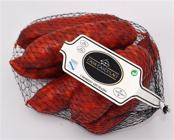 Derivado cárnico crudo curado-madurado elaborado con carnes de cerdo picadas y amasadas con sal, pimentón y ajo, embutido en tripa natural y sometido a un proceso de maduración-desecación con ahumado con madera de roble. Envasado dentro de una malla