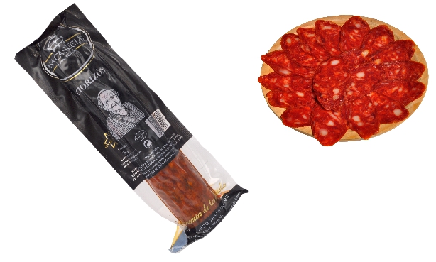 Elaborado con carne de cerdo especiada, embutido en tripa natural, ahumado con leña de roble y sometido a un proceso de curación. Envasado al vacío en medias piezas.