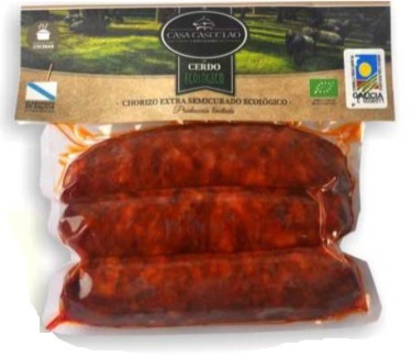 Producto cárnico elaborado a base de carne de cerdo ecológico picada y condimentada, embutida en una tripa natural de cerdo y ahumada con madera de roble y Sometido a un posterior proceso de curación.