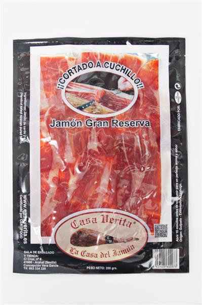 Sobre de Jamón Gran Reserva cortado a cuchillo de forma artesanal y envasado al vacío. Sobre de 200 gr.