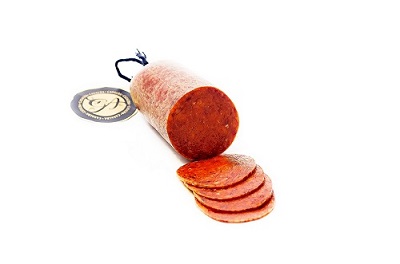 Producto untuoso, elaborado con magos, piezas grasas  ( papada, panceta) y pimentones seleccionados (de la Vera, con un toque de ahumado, y de Murcia, de matices frutales), picado fino y embutido en tripa natural, con nuestra propia receta.  Secado con brasero de leña de encina, y curado en secadero natural de dos a tres meses.