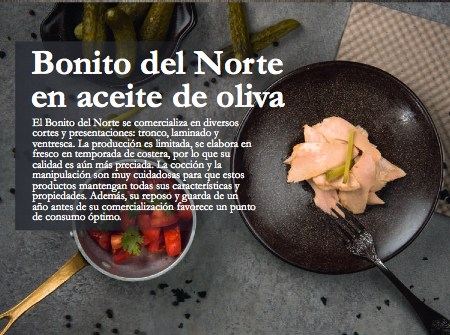 Ventresca, láminas y tronco de Bonito del Norte en aceite de oliva o AOVE ecológico