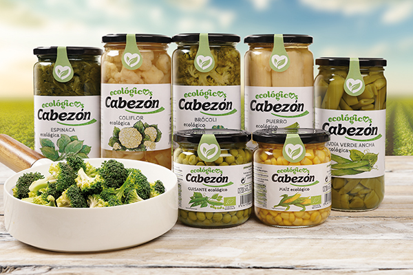 Verduras ecológicas de:Espinaca, Coliflor, Brócoli , Puerro, Judía verde,  Guisante y Maíz; marca Cabezón ecológicos; formato cristal V-720 y B-370.