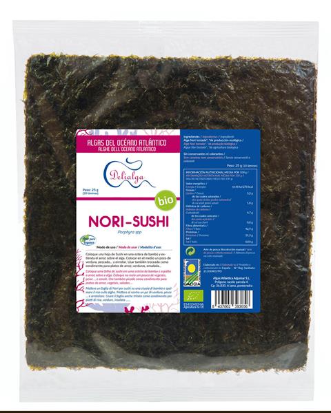 Ingredientes: Alga Nori* (Porphyra spp.) tostada. *De producción ecológica. Deshidratadas a baja temperatura (<42ºC). (Producto ecológico y elaborado a partir de materias primas ni compuestas, ni producidas a partir de OGM)