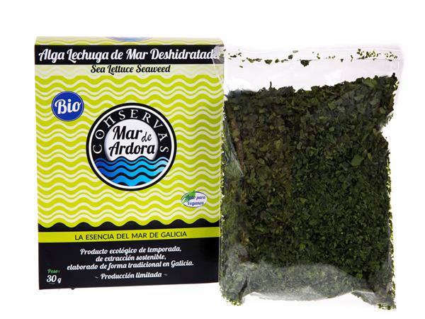 Ingredientes: Alga lechuga de mar (Ulva spp.)* deshidratada a baja temperatura (<42ºC).*De producción ecológica. (Producto ecológico y elaborado a partir de materias primas ni compuestas, ni producidas a partir de OGM)