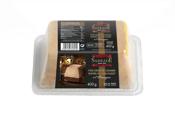 Sarrade propone una receta deliciosa y emblemática del Suroeste de Francia, suavemente salpimentada y con un toque de Armañac con un final de boca potente y azucarado. El envasado de nuestros foie gras ha sido diseñado por profesionales de la restauración. En este caso, la tarrina termosellada facilita el desmoldado mediante una sencilla presión en la barqueta y su corte limpio mediante un cortador especial para foie gras permite obtener lonchas impecables.