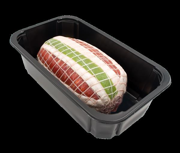 Aleta de vacuno marinada rellena de carne picada de vacuno tipo burger meat con pimiento, champiñón, aceitunas, jamón y bacon. Albardado con tocino y adornado con pimiento texturizado.