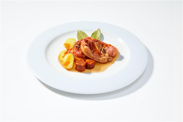 Codillo de cerdo salmuerizado serrado, acompañado de chorizo elaborado sin conservantes ni colorantes, patatas y salsa. Cocinado en el propio envase en autoclave. Producto pasteurizado.También disponible en formato de 2,5 kg, para colectividades y Horeca.