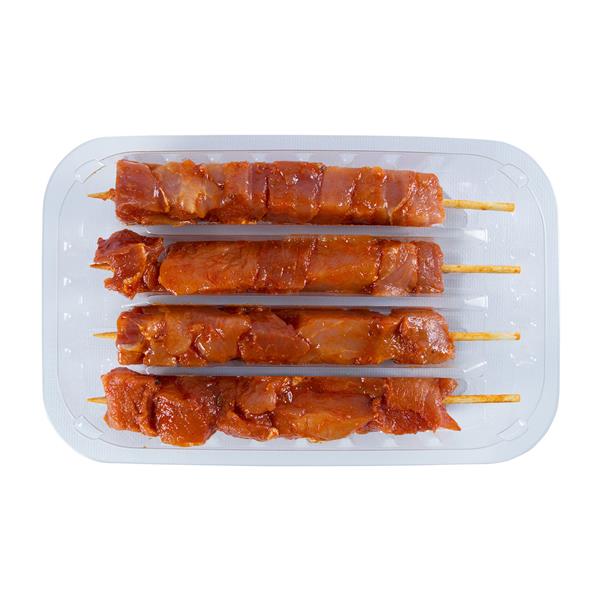 Jamón de cerdo salmuerizado, adobado cortado en tacos y ensartado en palo de madera de uso alimentario.Opción: ensartado a mano en palillo de aluminio de uso alimentario.