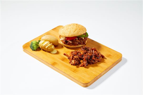 Tierna carne de cerdo en tiras, asado a fuego lento, ahumado y acompañado de nuestra receta de salsa BBQ