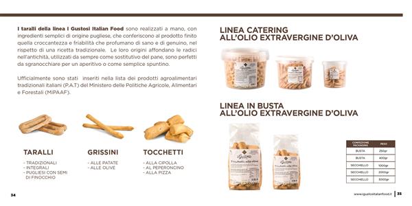“I Gustosi Italian Food”, en Cerignola de más de dieciséis años, es una empresa dedicada al cultivo de productos agrícolas típicos de Apulia, que trabaja y confecciona en el proprio establecimiento de producción, ofreciendo frescura y sabor de Apulia en toda Italia y al extranjero. Los productos de la empresa están garantizados por su frescura y bondad gracias a la intera elaboración de la empresa, por personal calificado, con la ayuda de equipos de última generación. El proceso, realizado íntegramente dentro de los dos establecimientos de Cerignola, implica el cultivo, la selección de materias primas, que luego se trabajan y envasan, utilizando exclusivamente productos de excelencia. La hilera productiva se supervisa cuidadosamente para garantizar el cumplimiento de los más estrictos estándares de higiene requeridos por la industria, además de la bondad del producto suministrado. Las conservas "I Gustosi Italian Food", producto en aceite y encurtidos están certificados como "Productos de calidad" y se ofrecen en varios sabores para satisfacer las diferentes necesidades del usuario final. El sabor y la autenticidad son características distintivas de la nueva línea de platos preparados congelados y frescos: primeros y segundos platos de carne y pescado, productos horneados orgánicos y aceite de oliva virgen extra y una línea de postres orgánica, vegetariana, no hay componentes origen animal. De aquí viene el deseo de difundir nuestros productos por su inclusión en las máquinas expendedoras, lo que garantizará el "listo - para - comer" servicio, proporcionando un producto sano, orgánico, calidad certificada, para comer "rápido", pero al mismo tiempo "bueno".