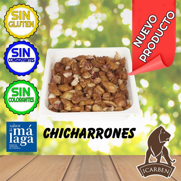 Chicharrones típicos de Andalucía. Elaborados artesanalmente gracias a una antigua receta que aún hoy se sigue al pie de la letra  Con trozos selecionados de panceta de cerdo, se fríe lentamente durante unas 5 horas condimentados con ajos, laurel y especias naturales nace un plato jugoso y con solera