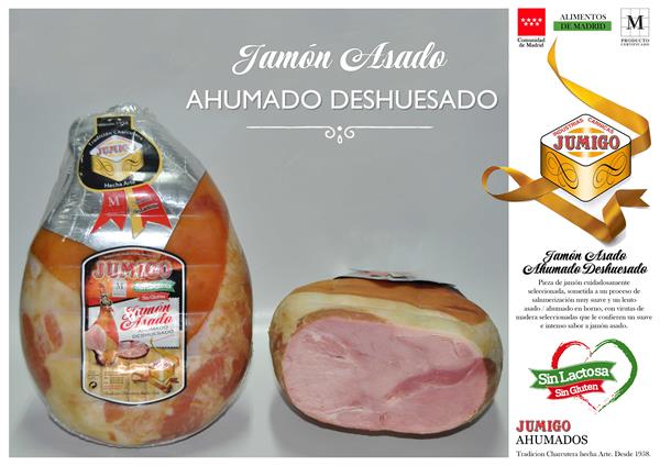 Pieza de jamón de cerdo cuidadosamente seleccionada, deshuesada, desgrasada y desnervada, sometida a un proceso de salmuerización muy suave y lento asado/ahumado en horno, con virutas de madera seleccionadas, que le confieren un suave e intenso sabor a jamón asado.