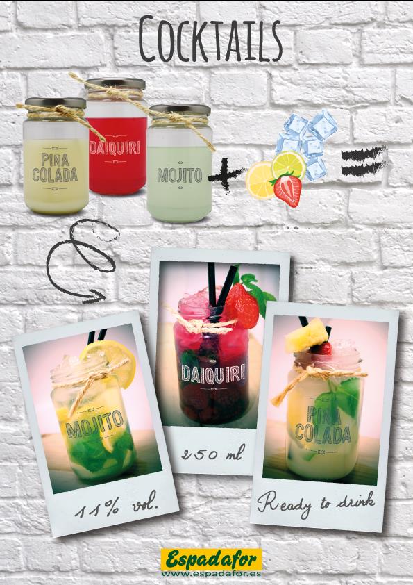 ¡El producto más deseado en los locales de moda! El tarro es el vaso, sólo hay que destapar, añadir hielo, decorar... y listo para tomar!! En los sabores más demandados: Mojito, Daiquiri y Piña Colada