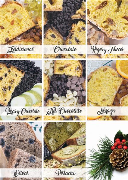 Gusto tradicional (con uva pasa), con chocolate, con pera y chocolate, con higos, con tres chocolates (chocolate negro, chocolate blanco y chocolate con leche), con naranja, con pistacho...