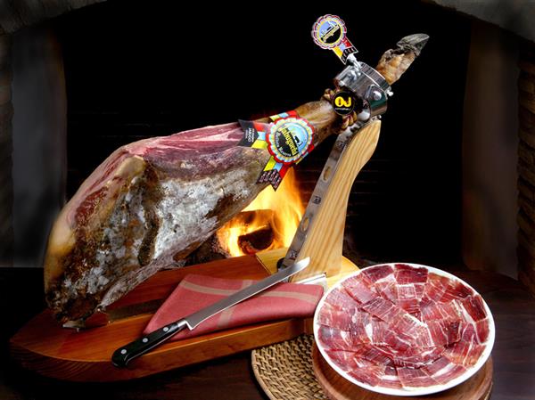Jamón Ibérico de Bellota de Jabugo 50% raza ibérica sin hueso: pata trasera curada de cerdo ibérico, criado en libertad y alimentado en montanera con bellota y hierbas (50% de su peso). Peso medio, 4,5-5’5 kg./pieza. Curación mínima de 36 meses.