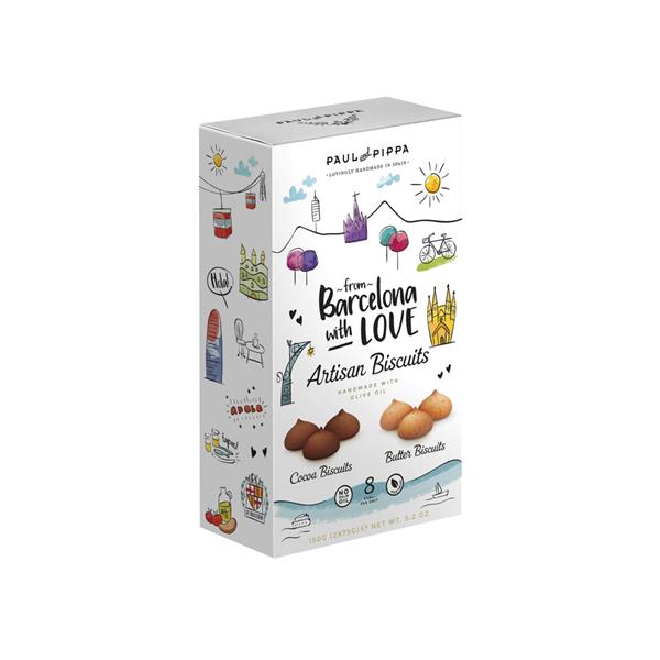 Surtido de bocaditos de mantequilla de dos sabores, separados en packs individuales: bocaditos de cacao y bocaditos de mantequilla. Todos los sabores son elaborados con aceite de oliva virgen extra, quinoa y mantequilla natural de máxima calidad.