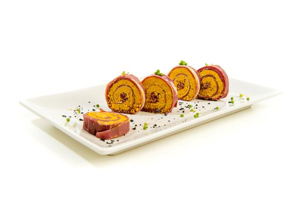 Magret de pato ahumado, enrollado con foie en forma de maki.