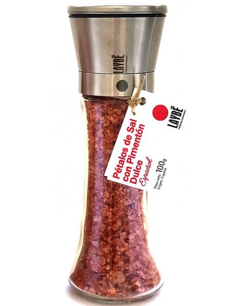 Molinillo cristal-Acero inx. Pétalos de Sal con Pimentón dulce Español, 100g.