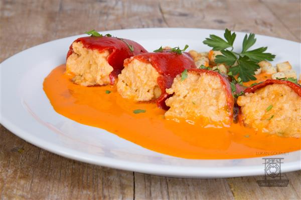 Pimientos rellenos con una fina bechamel a base de buey de mar, leche de caserío y mantequilla acompañados de nuestra emulsión de piquillos. Plato listo para servir. Formatos individual refrigerado, granel refrigerado, individual conserva. Caducidad refrigerados 3 meses, conservas 2 años