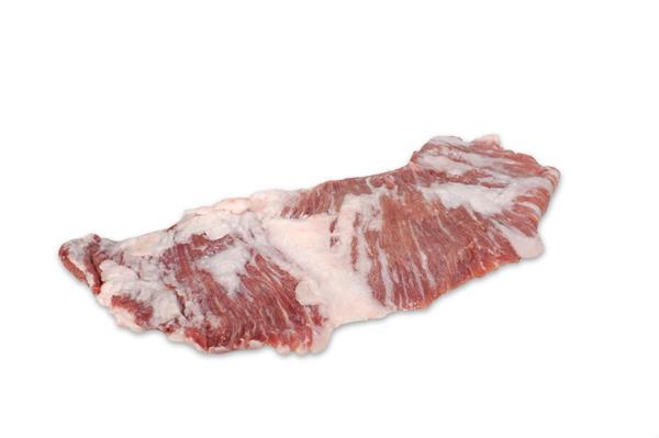 Pieza alargada y plana en forma de abanico. Jugosa debido a su contenido de grasa infiltrada en la mitad de la pieza y a lo largo del corte