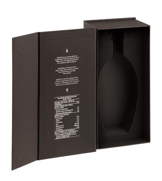 "ORO LÍQUIDO".NUESTRO BIEN MÁS PRECIADO GUARDADO EN UN ESTUCHE  QUE MIMA CADA UNA DE SUS PARTES,EN CUANTO A PROTECCIÓN DEL VIDRIO ANTE POSIBLES GOLPES, Y PROTECCIÓN DEL PROPIO AOVE PREMIUM EN CUANTO AL IMPACTO DE LA LUZ Y CAMBIOS DE TEMPERATURA.UN ESTUCHE PREMIUM QUE ENVUELVE UNA PRESENTACIÓN ELEGANTE QUE  EMPODERA AÚN MÁS AL PRODUCTO.