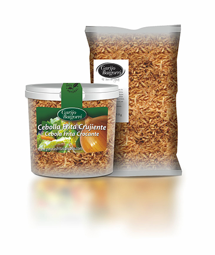 "Topping" para Ensaladas de Cebolla Frita Crujiente, con certificado RSPO. Disponible en bolsa de 500 gr y en tarrina de 100 gr y  de 150 gr.