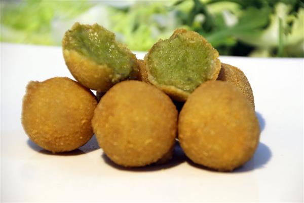 Croqueta de espinacas cocinadas tradicionalmente con trocitos de jamón y con una suave y cremosa bechamel tradicional y terminados con un empanado casero.