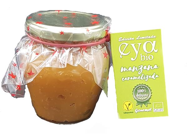Manzana Caramelizada elaborada a base de ingredientes 100% vegetales procedentes de agricultura ecológica, sin conservantes ni colorantes.