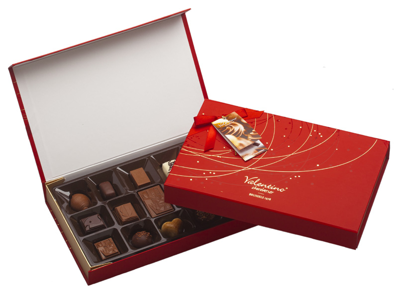 Valentino Chocolatier, nos ofrece un estuche de lujo con un surtido especial de Chocolates Belgas en el que puedes encontrar chocolate negro, con leche y blanco, y rellenos de avellanas, ganaché y mazapán, y frutas.