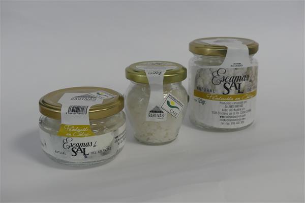 Escamas de Sal Atlántica Ecológica recolectada artesanalmente en territorio de Parque Natural Bahía de Cádiz (Chiclana de la Frontera-España) Presentada en tres tamaños de tarros de cristal.