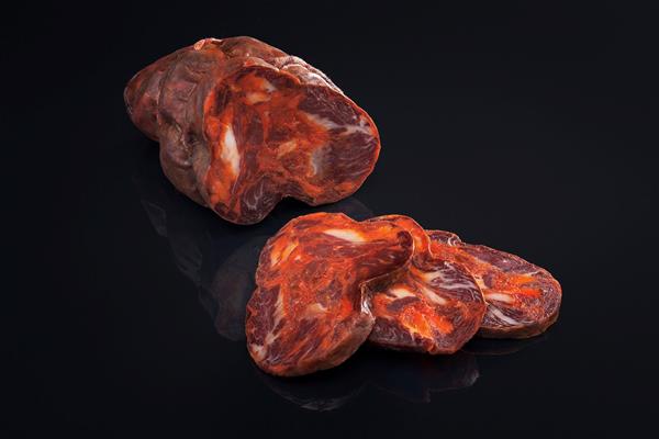 Elaborado con presa de paleta troceada a mano y magros de cerdo de bellota 100% ibéricos, embutidos artesanalmente en tripa natural de ciego. En el adobo sobresale el pimentón dulce. Su curación en bodega natural supera los 6 meses. Una vez cortado obsequia a la vista un aspecto marmóreo con predominio de la presa de color rojo oscuro, y de magros más vivos .