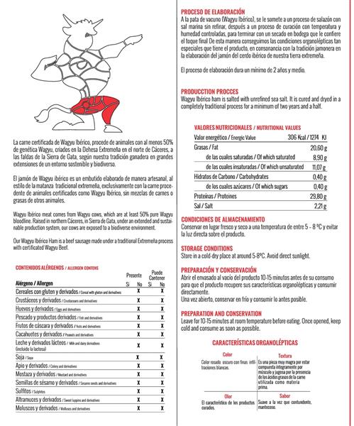 Wagyu Iberico es una marca de calidad de los propios ganaderos de vacuno de la raza Wagyu, certifica las carnes están controladas por nuestra marca y auditada por CERTICAR. Es la única marca de calidad con etiquetado facultativo que garantiza que el animal de la carne cumple con, al menos el 50% de su genética es de la raza wagyu. Están como mínimo 5 meses con las madres en la Dehesa extensivo, con una media de 6 meses, los piensos al menos en un 50% están compuestos por cereales, sin urea y sin grasas animales.