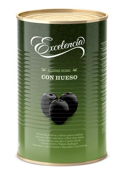 Aceitunas negras con hueso en lata de 2500g. Las aceitunas negras Excelencia destacan por su color negro intenso con un sabor inconfundible. Cuentan con características especiales como son la finura de su pulpa, la baja relación pulpa-hueso y la textura que mantiene una vez aderezadas. De textura carnosa y bajas en sal, son ideales como condimento en platos que van desde las ensaladas, pizzas, hasta las recetas más vanguardistas.