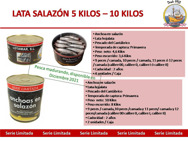 • Anchoa en salazón • Lata hojalata • Pescado del Cantábrico • Temporada de captura: Primavera • Peso neto: 4,6 Kilos/ 10 kilos • Peso escurrido: 3,6 Kilos / 8 kilos • 9 peces / camada, 10 peces / camada, 11 peces ó 12 peces / camada (calibre 00, calibre 0, calibre I ó calibre II) • Caducidad : 2 años • 4 / 2 unidades / Caja