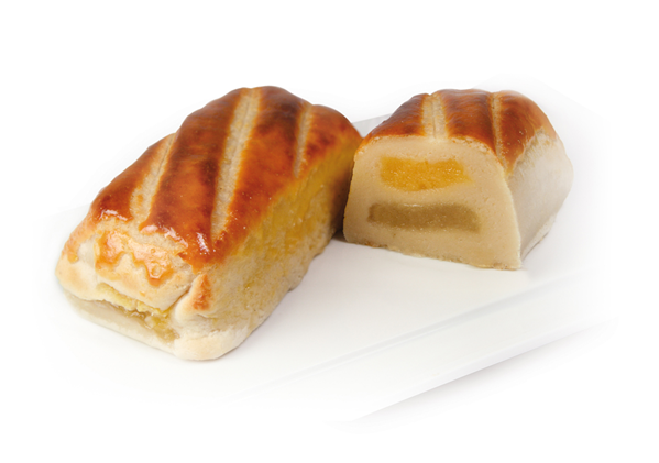 Mazapán relleno de confitura de yema y batata con forma de pan.