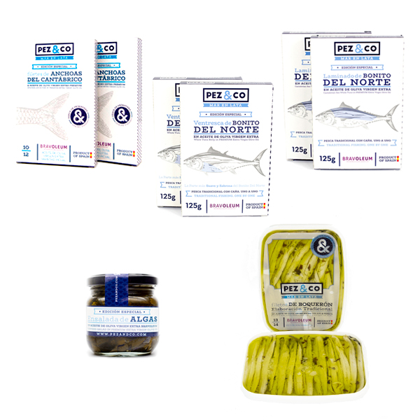 Filetes de anchoa del Cantábrico, laminado de bonito del norte, ventresca de bonito del norte, boquerones del Cantábrico y ensalada de algas. Todo bañado en Aceite de Oliva Virgen Extra Bravoleum, de la Variedad Picual, que mejora y potencia el sabor de estos productos.