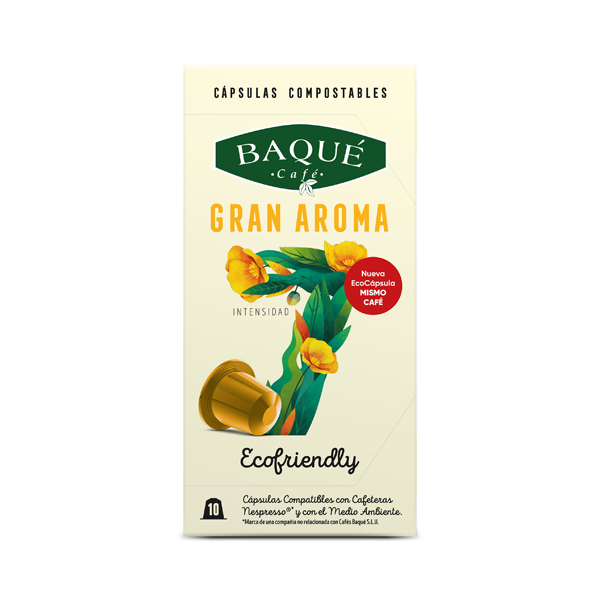 Cápsulas 100% compostables compatibles con cafeteras Nespresso®. Comprometidos con el cuidado del Medio Ambiente, hemos desarrollado esta solución innovadora, lanzando las primeras cápsulas compostables del mercado compuestas de materiales barrera, que evitan la oxidación y preservan la calidad de nuestro café Baqué de siempre. Se desechan en el contenedor orgánico y se degradan completamente en tan solo 3 meses sin dejar ningún residuo, en condiciones óptimas de humedad, temperatura y oxígeno.