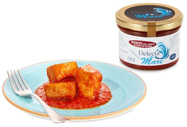 Plato tradicional de la cocina española. Magníficos trozos de bonito del norte cocinados en una riquísima salsa de tomate realizada tradicionalmente con verduras y aceite de oliva virgen extra.