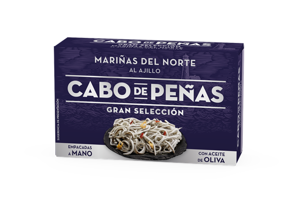 Nuestra línea de productos gourmet, Cabo de Peñas "Gran Selección", cuenta con una receta especial de surimi tipo angula, elaborado a partir de carne de pescado de primera calidad, aceite de oliva (54%), sal, ajo y guindilla.