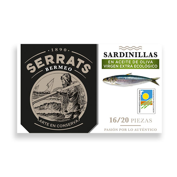 Conservas Serrats presenta sus sardinillas en lata de 120g y cubiertas de aceite de oliva virgen extra ecológico. Aproximadamente en una lata podemos encontrar entre 16 a 20 piezas.
