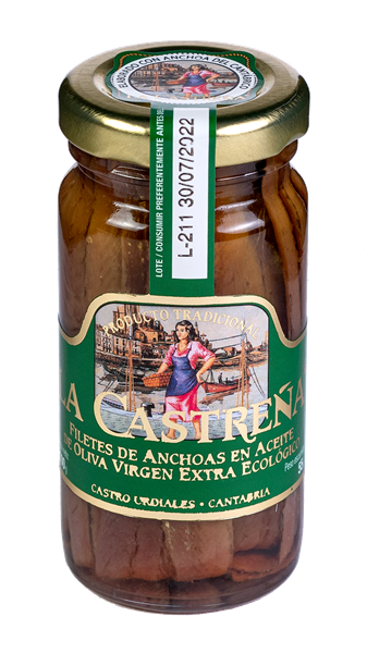 Filetes de anchoas elaboradas con anchoas frescas pescadas en el mar Cantábrico, y envasadas en aceite de oliva virgen extra ecológico. Para la elaboración de este producto se parte de la mejor materia prima, la auténtica anchoa del Cantábrico (en salazón, con una maduración superior a 18 meses en barril).