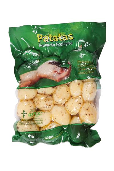 Pequeñas patatas de guarnición con un aliño de aceite de oliva virgen extra ecológico, ajo molido, perejil y cocinadas al vapor. calentar y emplatar
