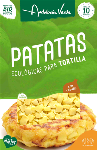 TROCITOS DE PATATA ECOLÓGICA CON TROCITOS DE CEBOLLA PELADA ECOLÓGICA, TODO ELLO SE PREPARA CON EL TOQUE JUSTO DE ACEITE DE OLIVA VIRGEN EXTRA ECOLÓGICO COCINADOS AL VAPOR.