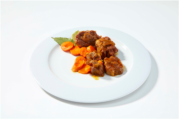Rabo de ternera serrado, acompañado de zanahorias y salsa al vino tinto. Receta tradicional.