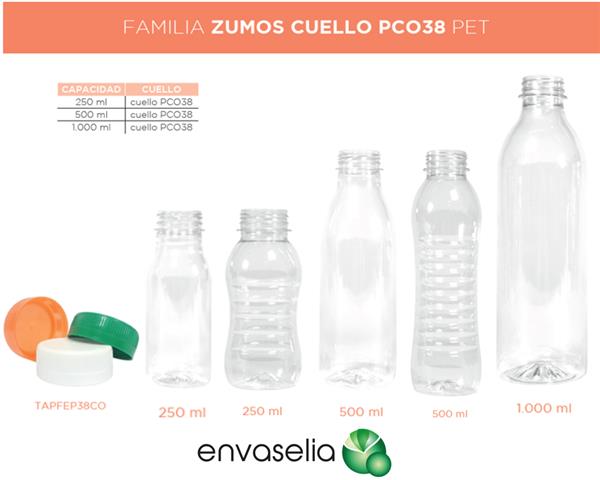 La gama especial para zumos de Envaselia dispone de botellas cilíndricas fabricadas en PET de 250 ml, 500 ml y 1 litro, estriadas o lisas. El material PET les aporta una gran resistencia y propiedades barrera para la máxima protección del contenido. Con un cuello PCO 38 para tapones a rosca. Amplia variedad de tapones para un cierre perfecto. Esta botella es muy utilizada en el sector de alimentación para el envasado de productos como zumos, leche, jugos, bebidas, gazpacho o salmorejo.